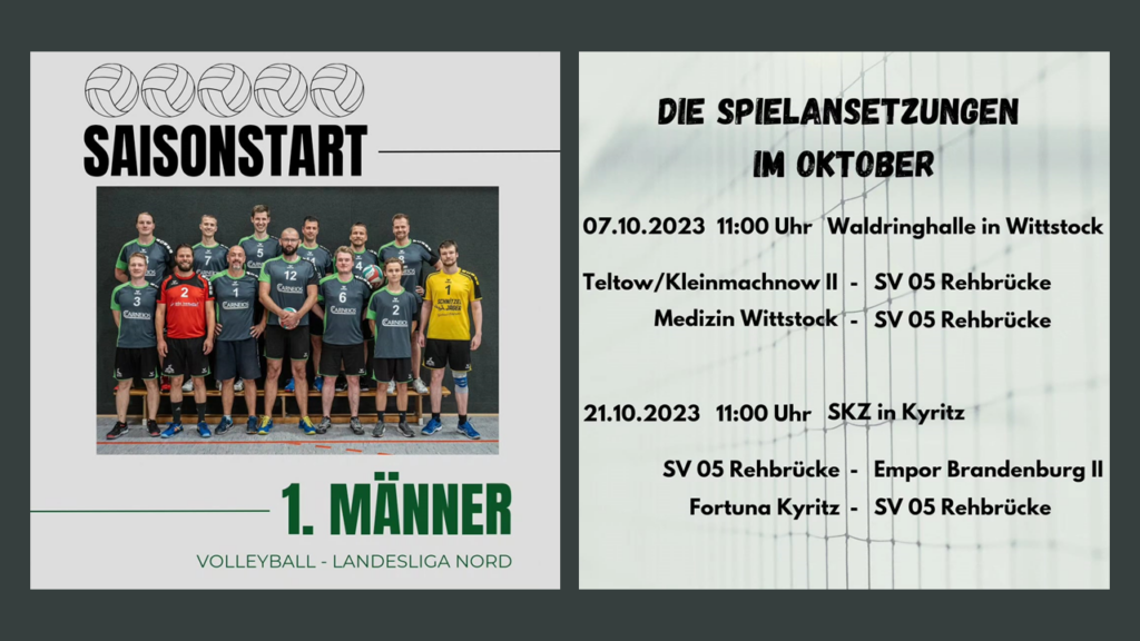 Am Samstag startet unsere 1. Männermannschaft der Abteilung Volleyball in die Saison. Am 07.10.2023 geht es zunächst nach Wittstock. Hier stehen die Spiele gegen die Teams Teltow/Kleinmachnow II und Medizin Wittstock auf dem Plan, ehe 2 Wochen später, am 21.10.2023, die Spiele gegen Empor Brandenburg II und Fortuna Kyritz anstehen. Das ausgerufene Minimal-Ziel ist klar:…