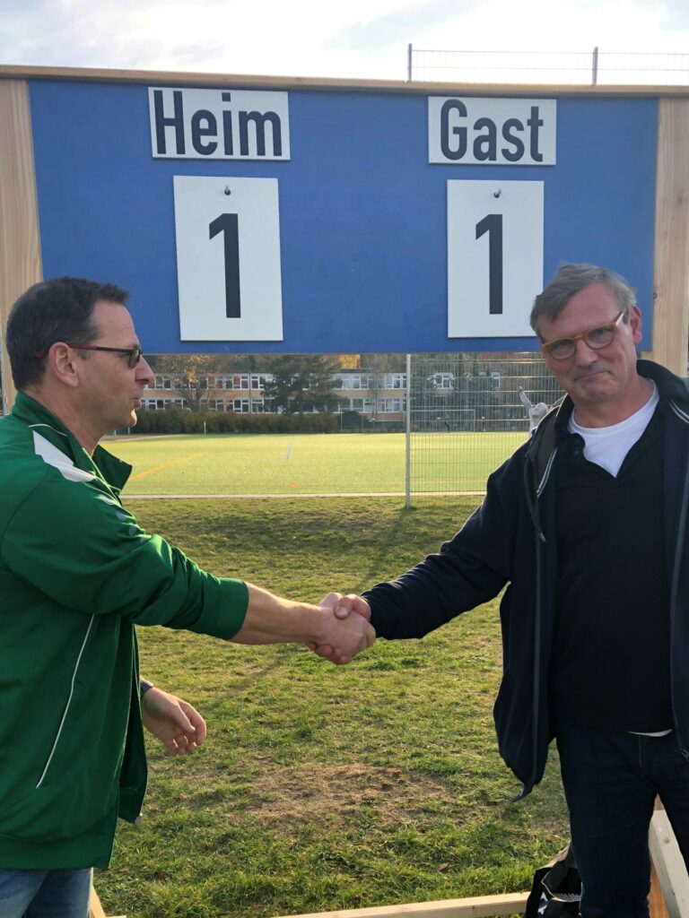 Einweihung der neuen Anzeigentafel zum Spiel der 1. Männer am 31.10. – Jörg Erxleben dankt dem edlen Spender Christian von Domarus