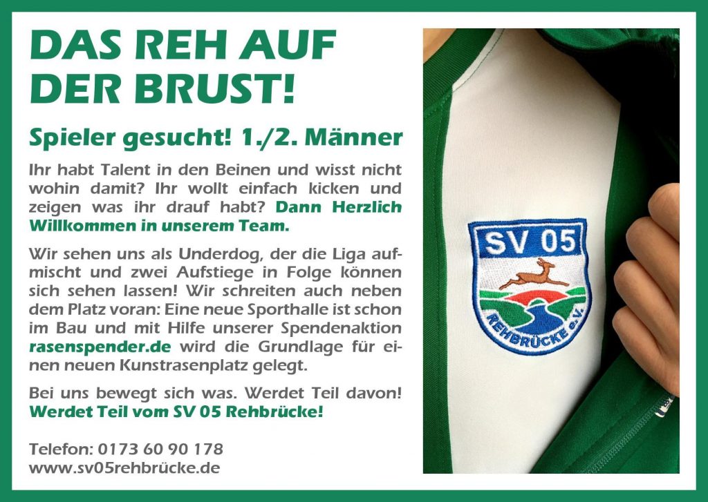 DAS REH AUF DER BRUST! Spieler gesucht! 1./2. Männer Ihr habt Talent in den Beinen und wisst nicht wohin damit? Ihr wollt einfach kicken und zeigen was ihr drauf habt? Dann Herzlich Willkommen in unserem Team. Wir sehen uns als Underdog, der die Liga aufmischt und zwei Aufstiege in Folge können sich sehen lassen!…